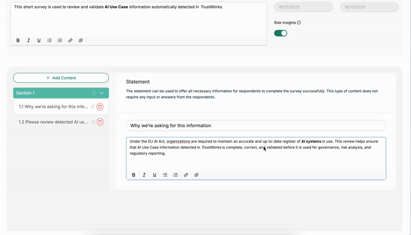 - Initiative: description, reference documents, assets or processing activities, related AI use case and custom attributes.