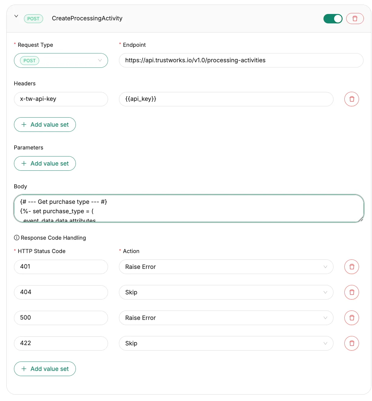 request.approvedevent), workflow variables such asevent_datawill be available for use. - In the next step of your workflow, configure an HTTP Request Action (such as "Create Processing Activity," "Send Notification," or any custom HTTP request to one of our API endpoints).