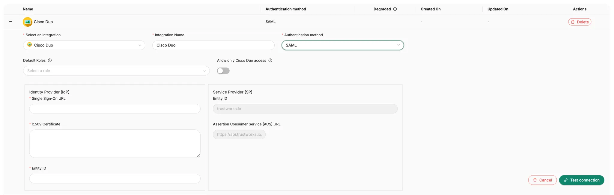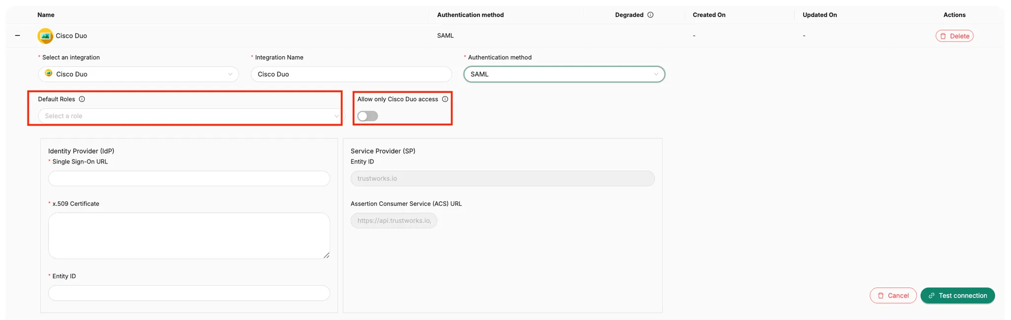 - Enable "Allow only Cisco Duo access" if you want to disable TrustWorks password login