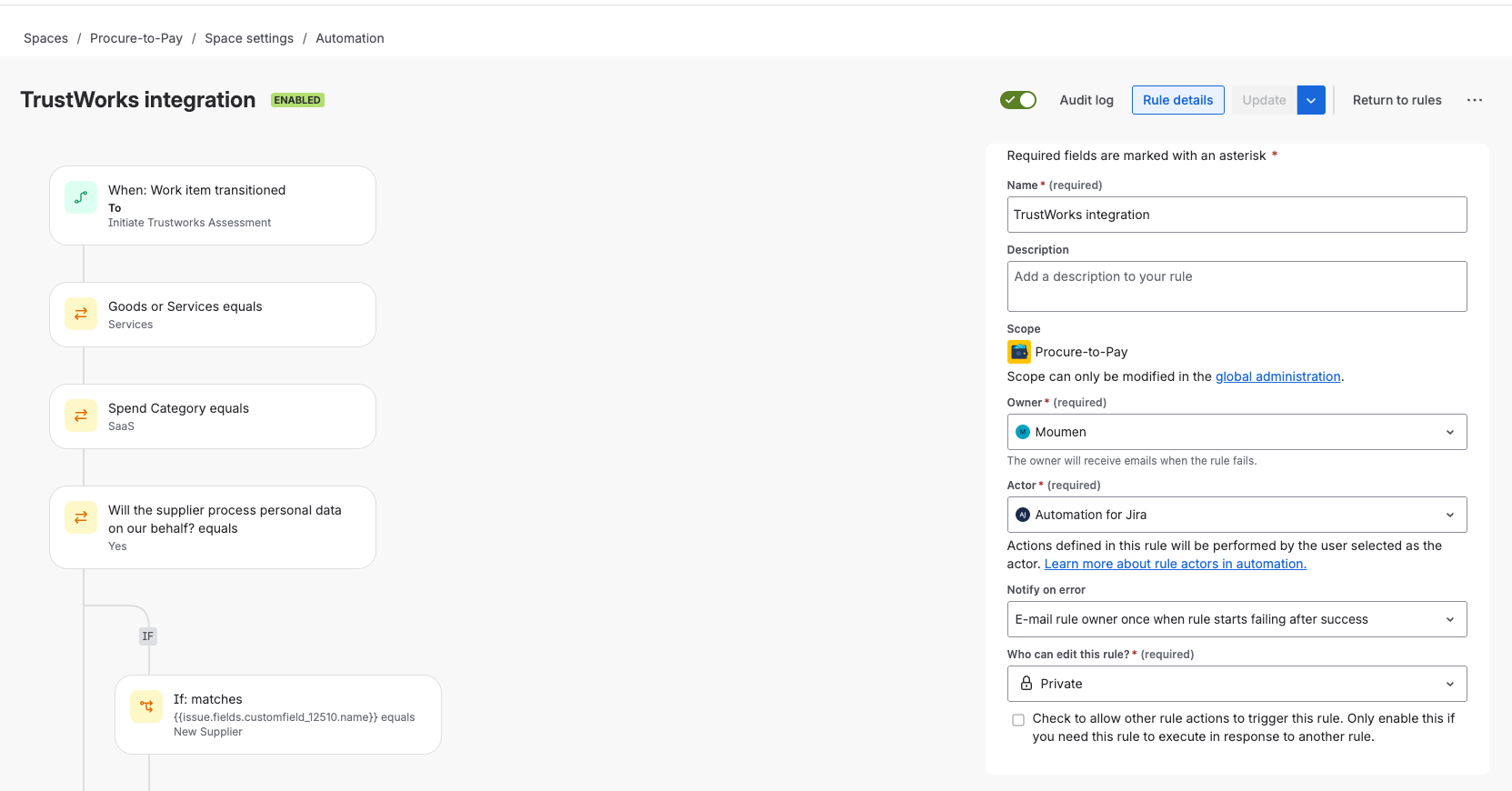 In most organisations, Jira already acts as the workflow engine for procurement, legal or privacy reviews. Using Jira Automation rules avoids any changes to your existing process. You simply extend the workflow to activate TrustWorks when needed.