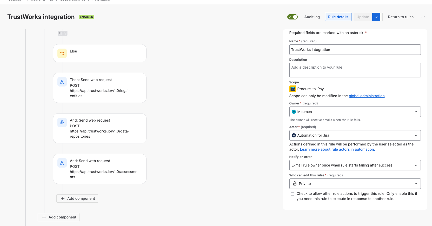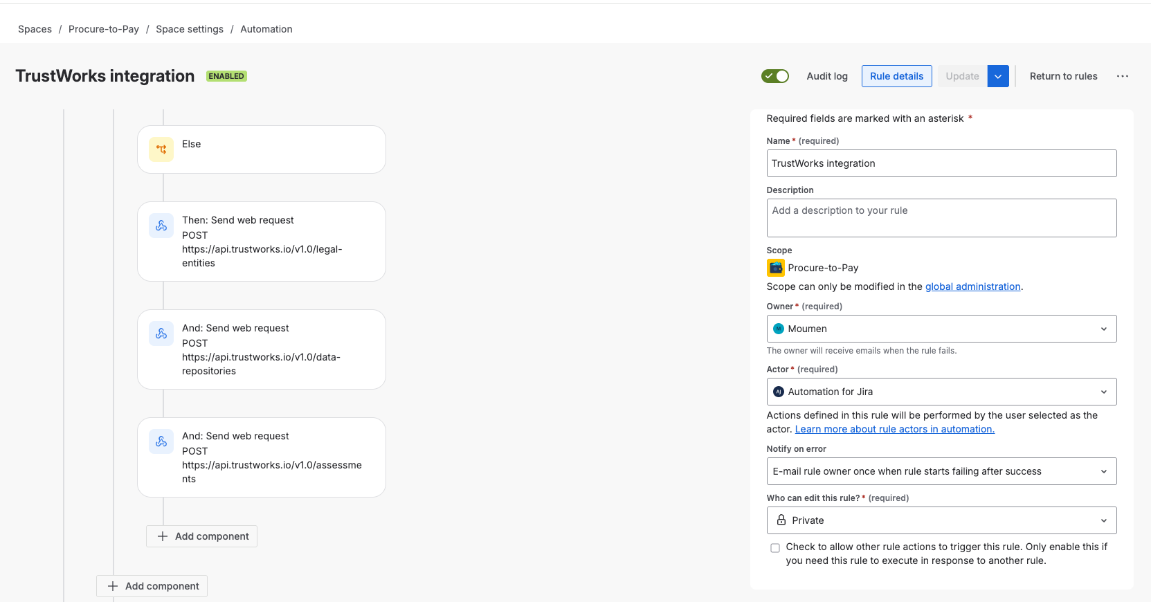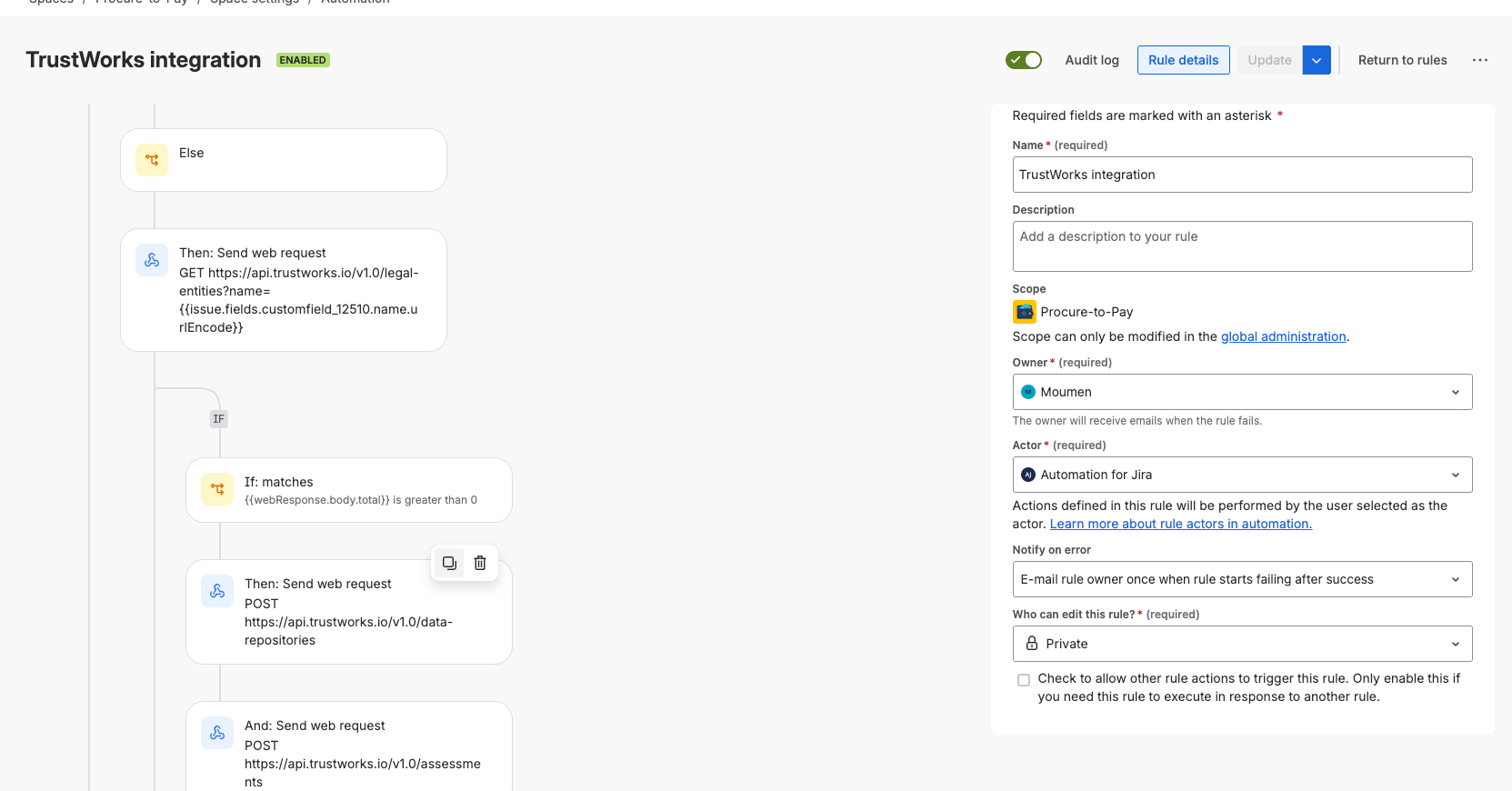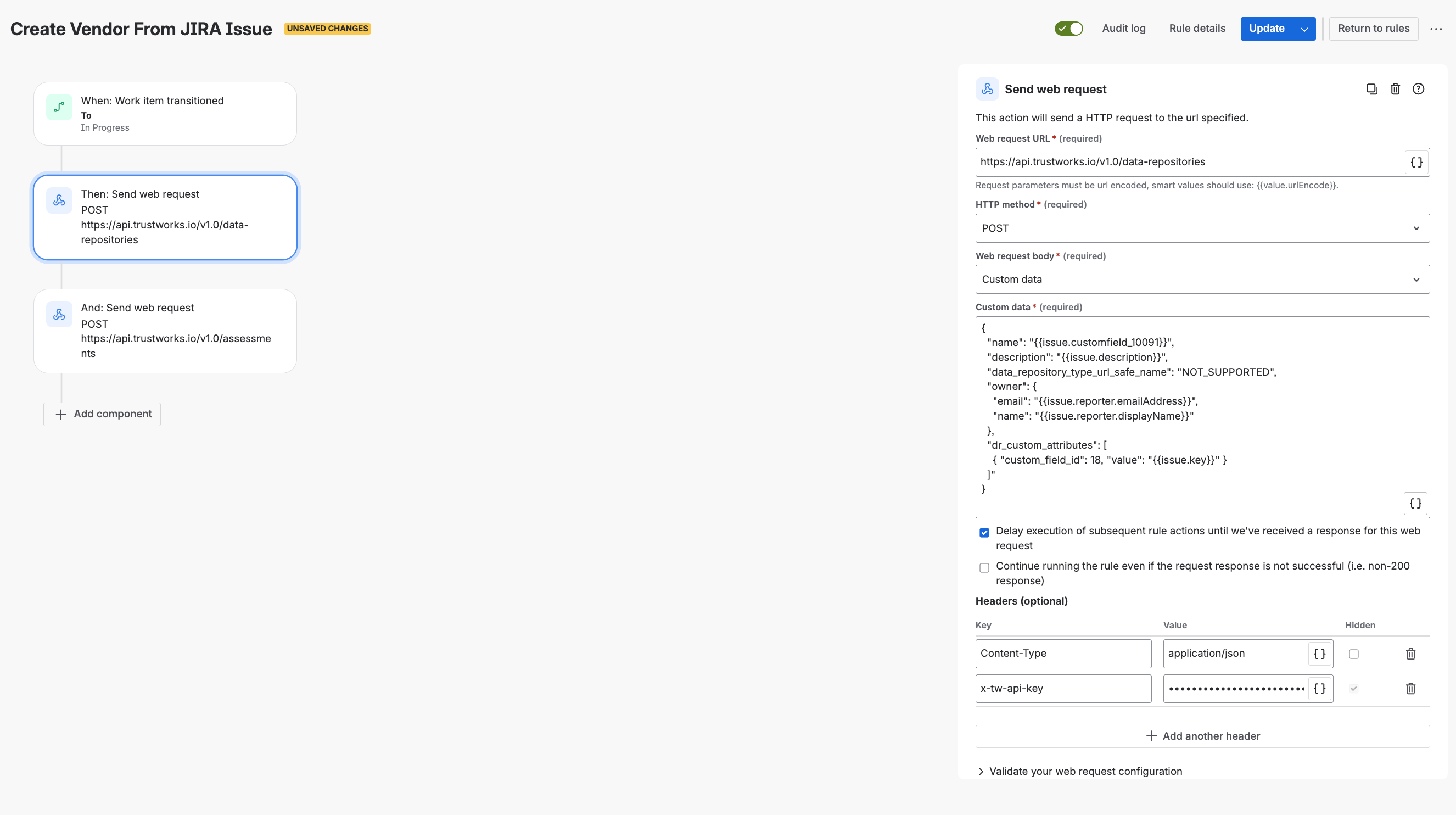 The automation rule sends a HTTPs request to TrustWorks (here’s a full list of our API endpoints: https://api.trustworks.io/redoc). The rule typically includes information such as: