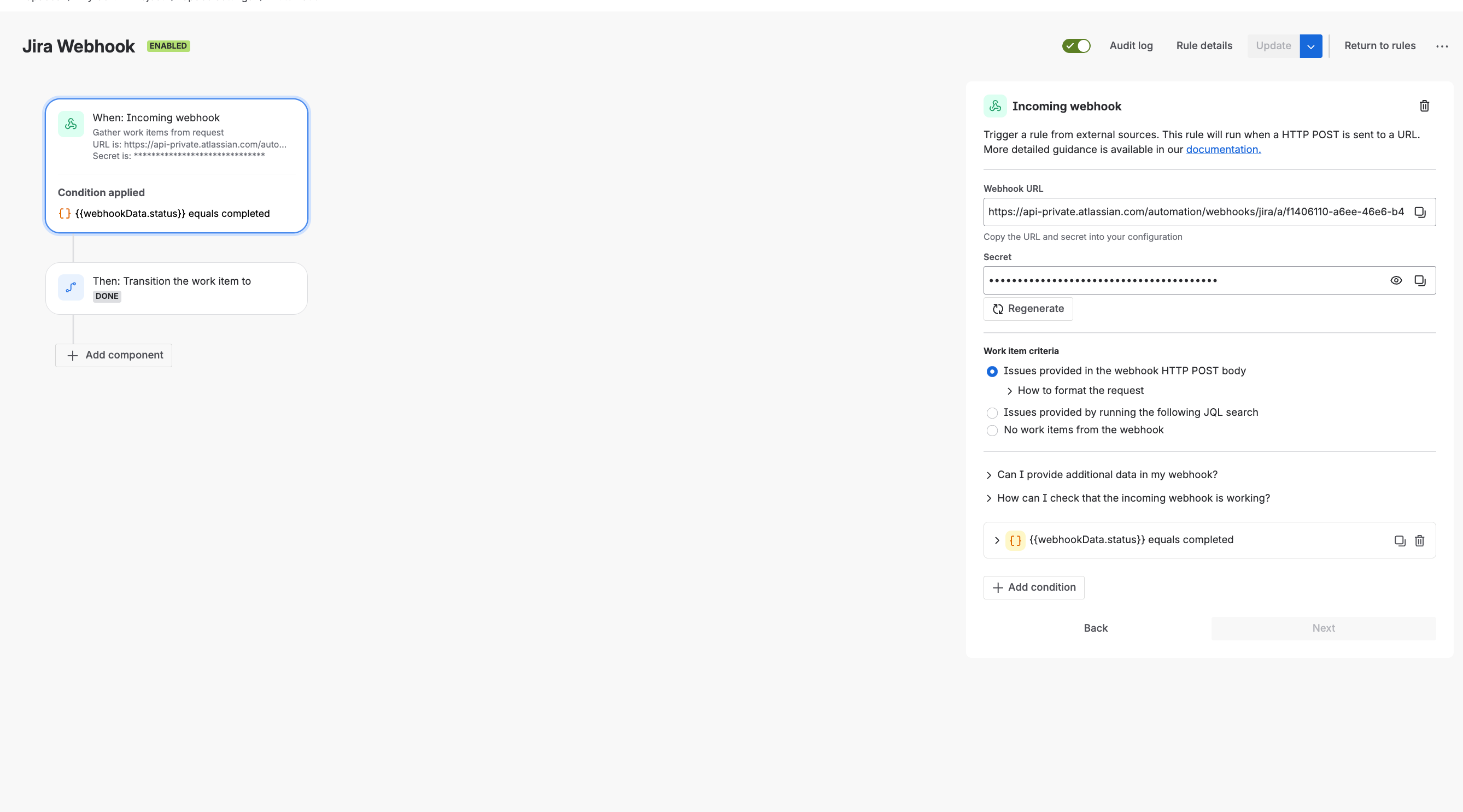 Here is an example structure of a Jira automation rule. This is shown for illustration, not as a fixed rule to copy: