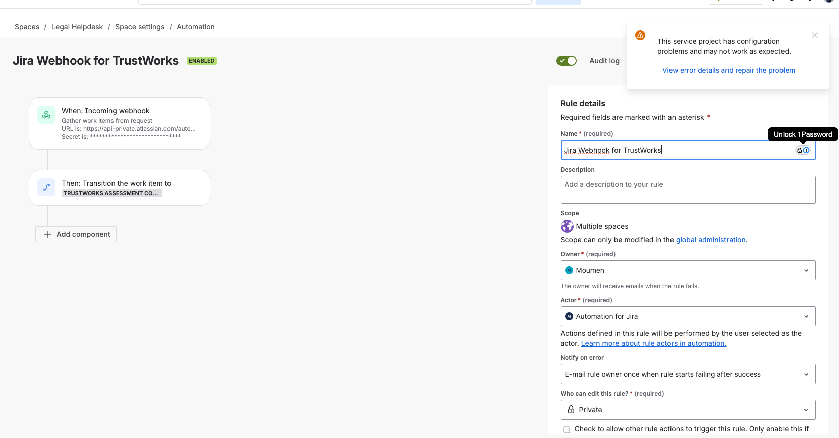 You do not need to replicate the exact workflows shown in this guide. The focus is on showing how Jira and TrustWorks can work together as part of an automated privacy or security process.