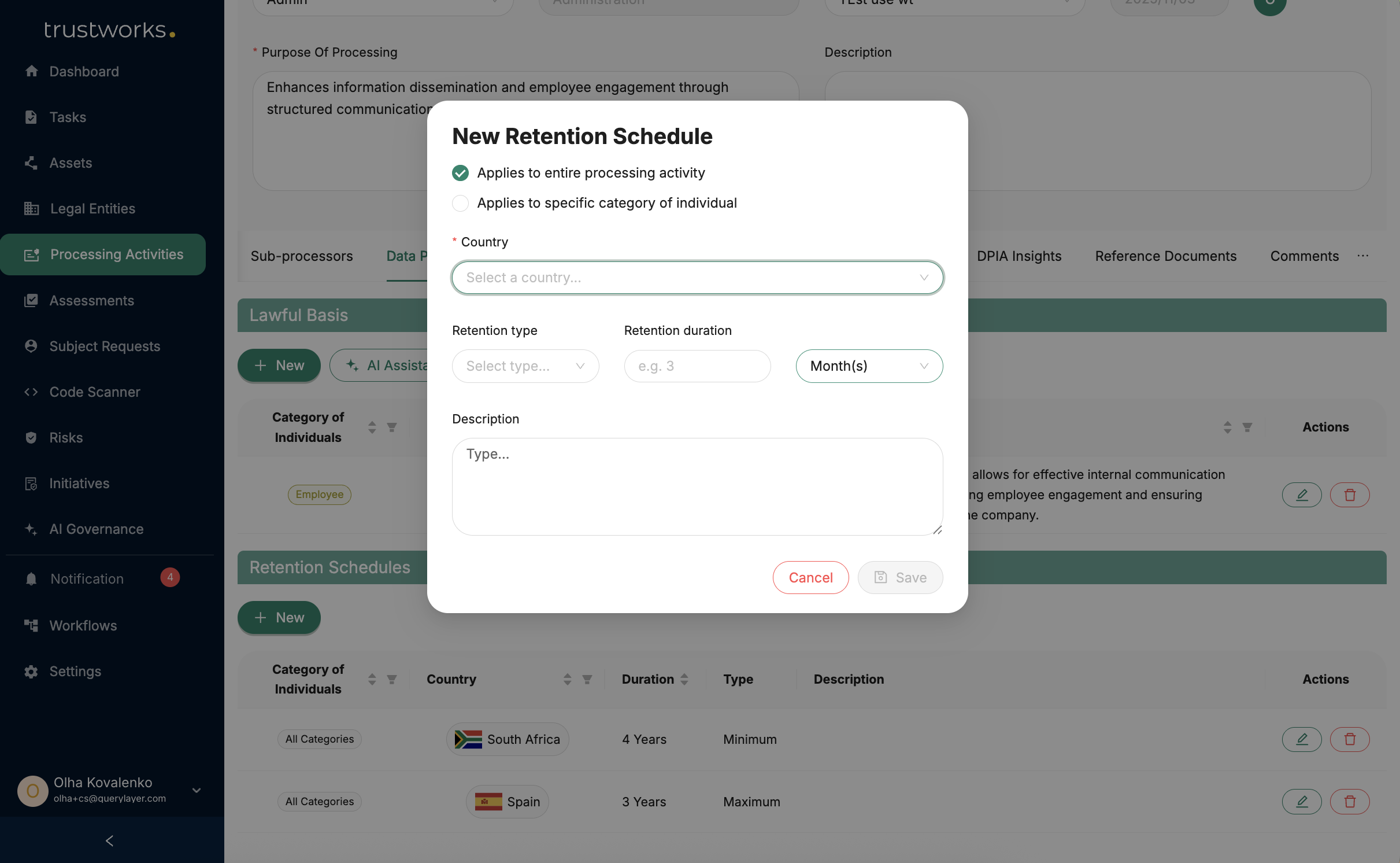Efficiently manage processing activities, approve, edit, or delete existing records, and leverage the AI-assistant feature for automated processing activity creation. With TrustWorks, organisations can ensure robust data privacy management and regulatory compliance.