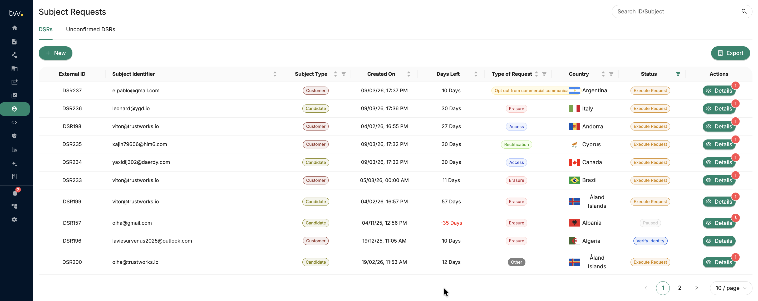 Data Subject Requests (DSRs) are requests made by individuals to exercise their data privacy rights, such as accessing their personal data, erasing it, rectifying inaccuracies, objecting to processing, requesting data portability, and more. These requests are a crucial part of ensuring privacy compliance within organisations, and TrustWorks provides a powerful platform for managing and processing DSRs.