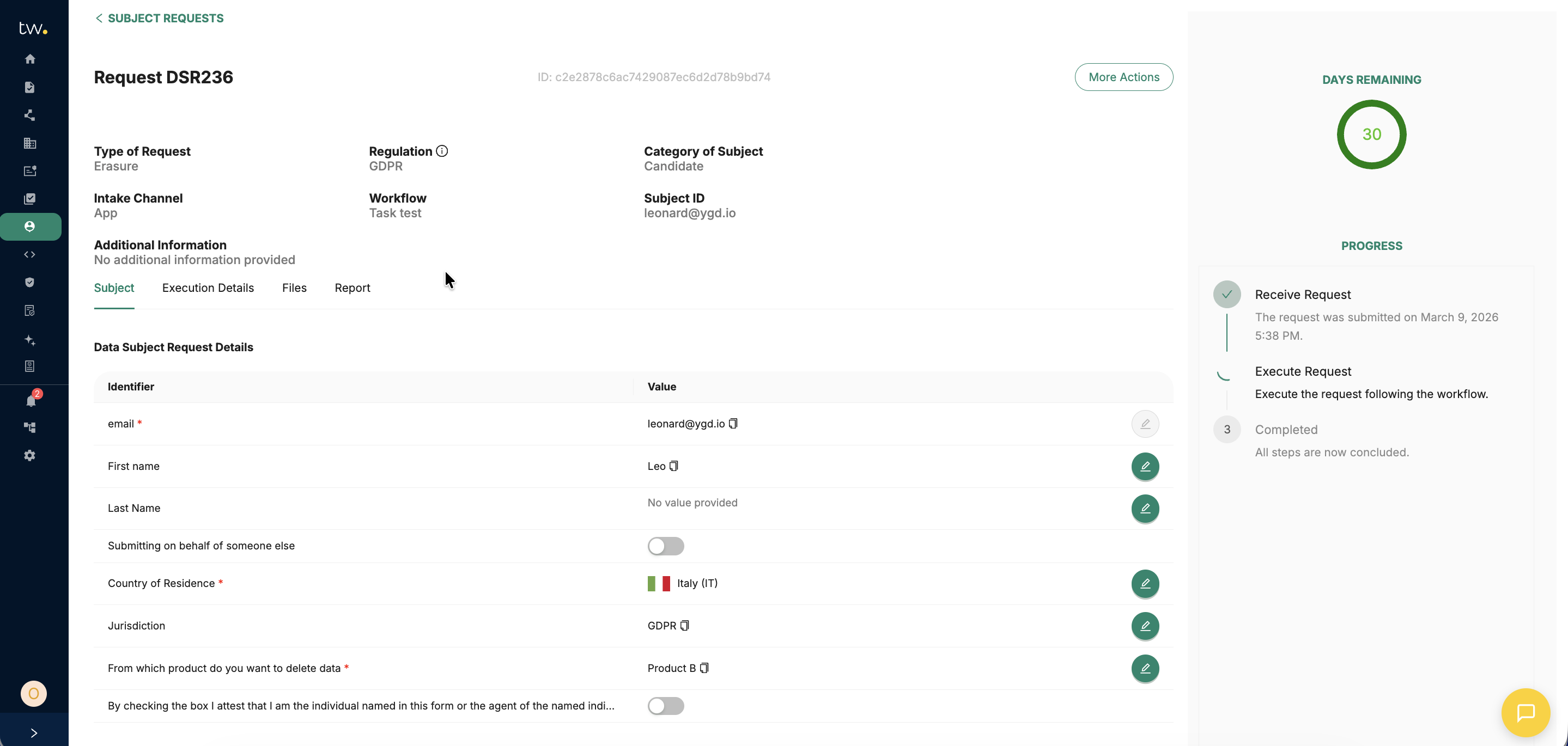 - Execute Request: Marks the phase where the request is processed and actions are taken based on the data subject's rights.