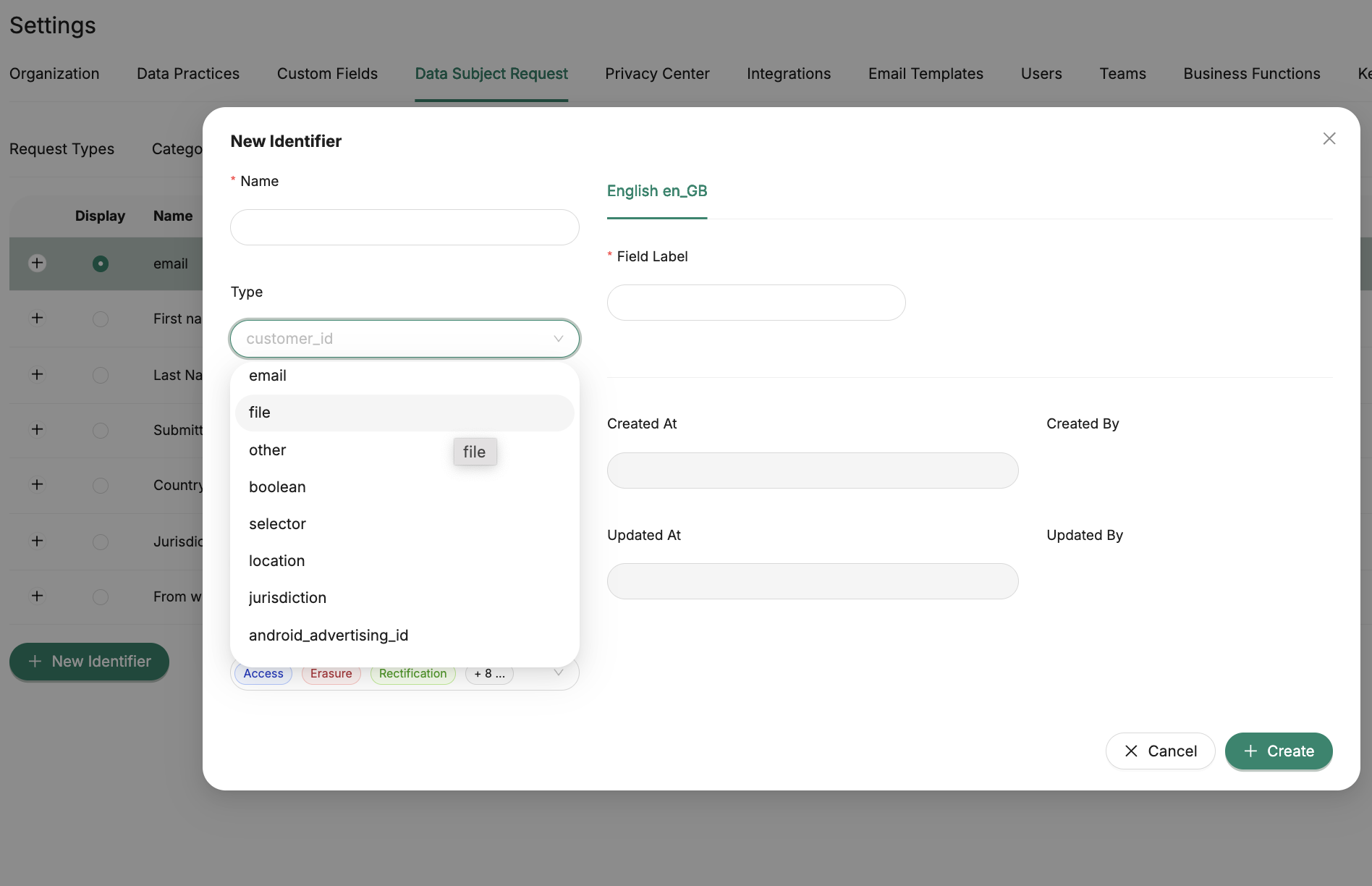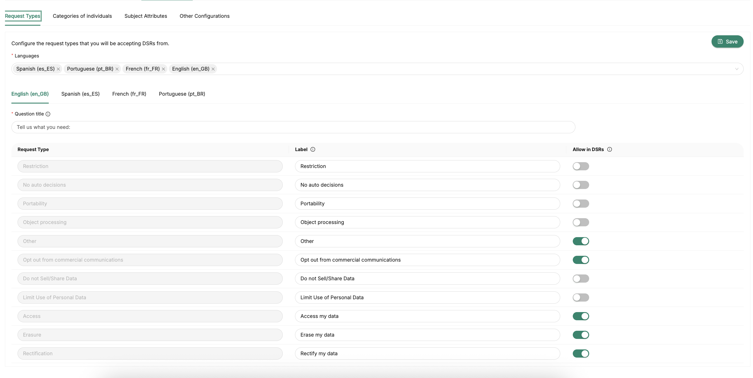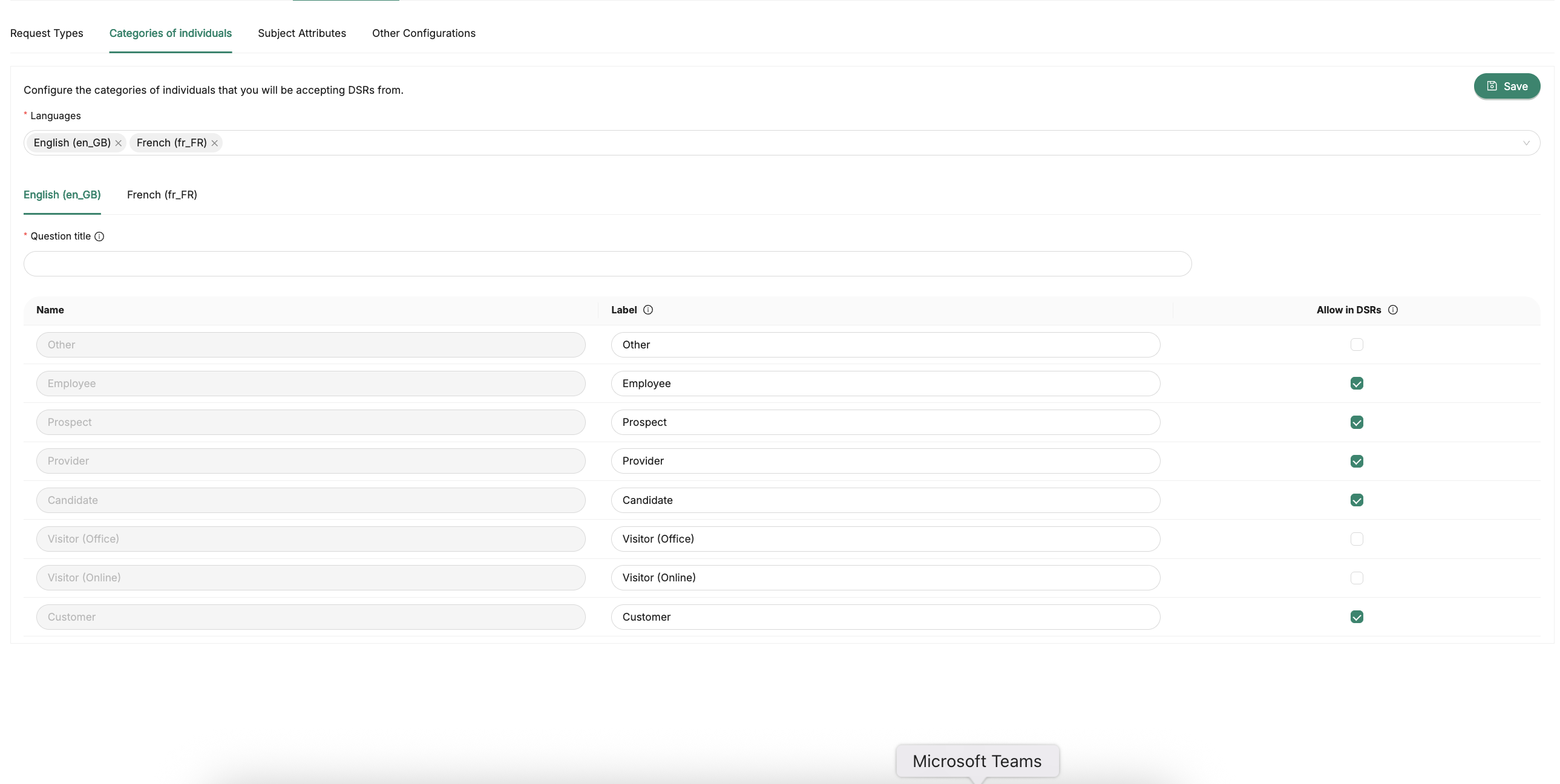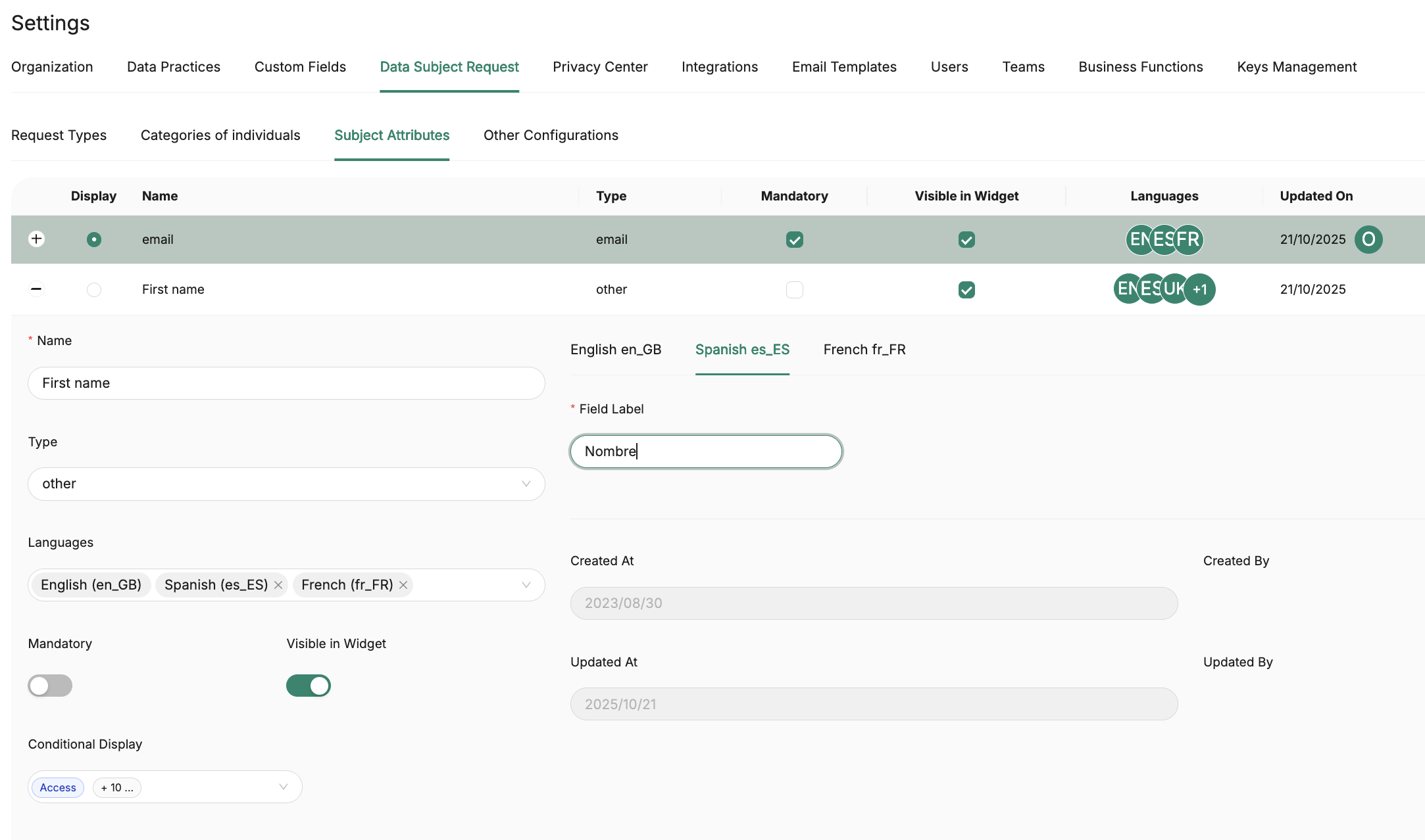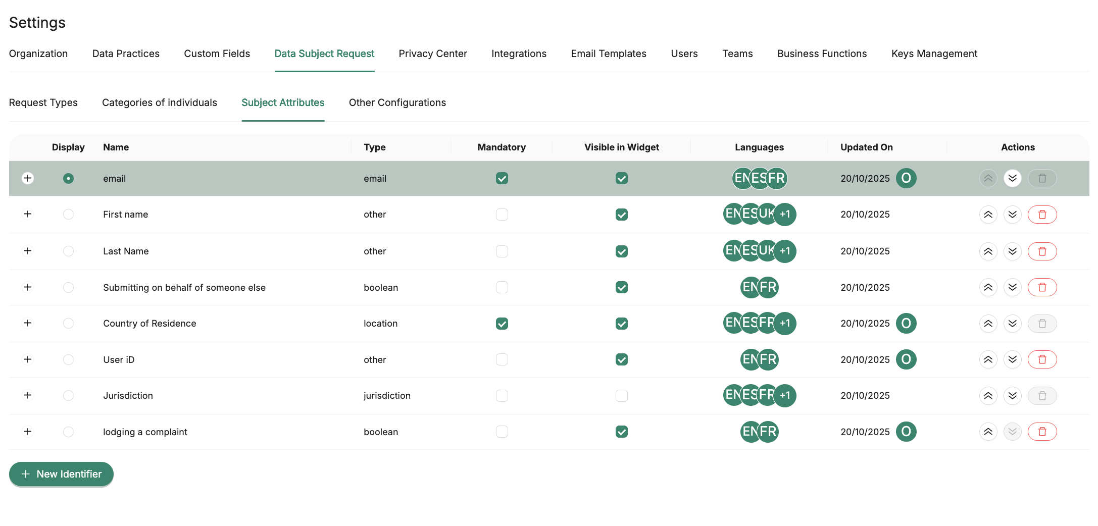 - Go to Settings → Data Subject Request → Subject Attributes.