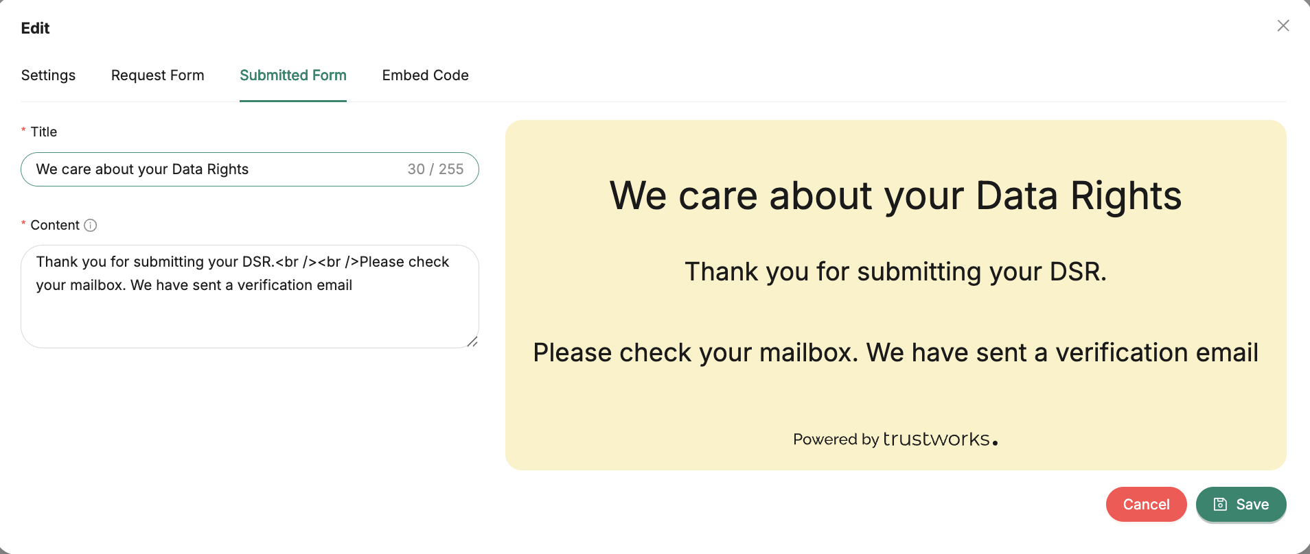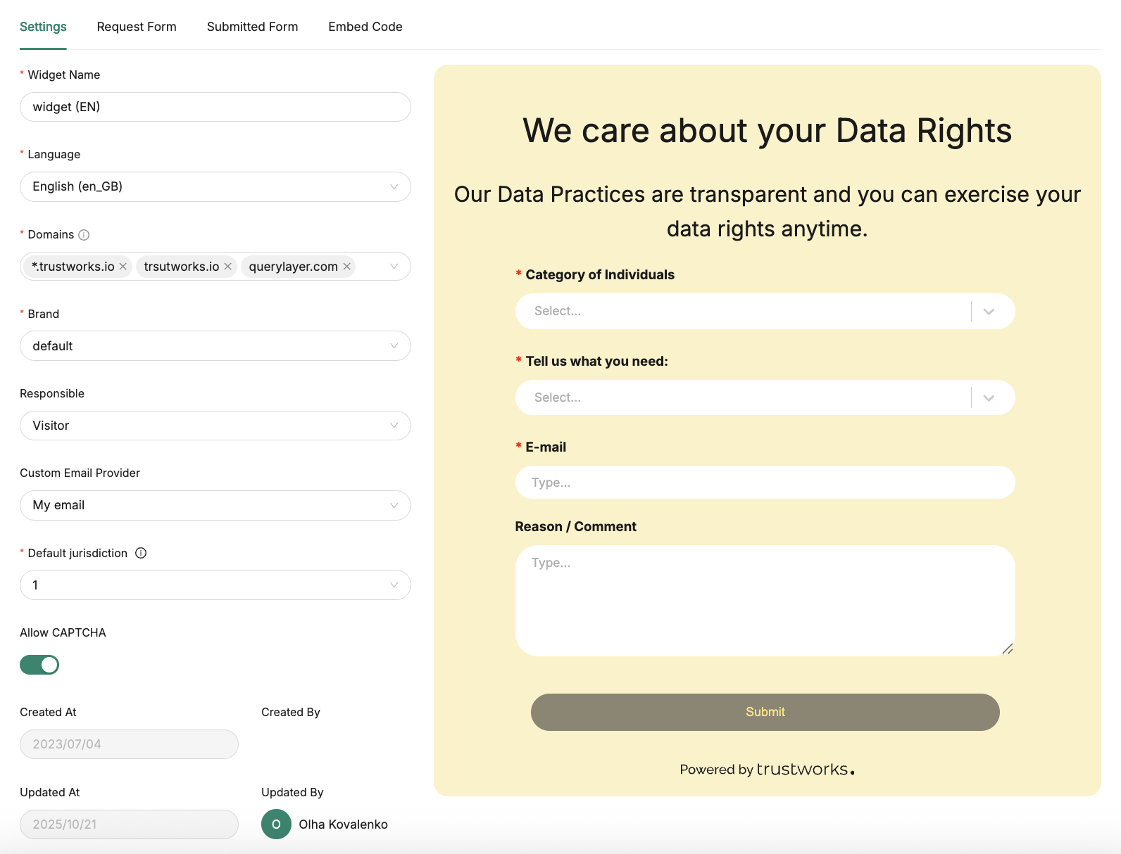 TrustWorks widgets make DSR intake simple, flexible, and compliant. By following these steps, administrators can configure, brand, and publish privacy request forms that fit their workflows and regional needs.