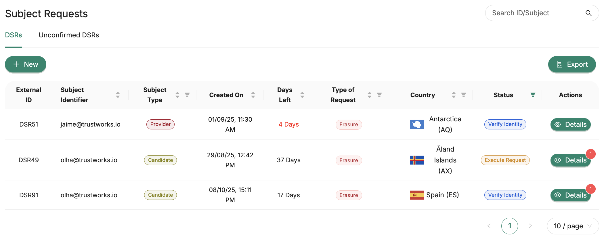 - Processing — After verification, the request appears in TrustWorks; unverified submissions remain pending.